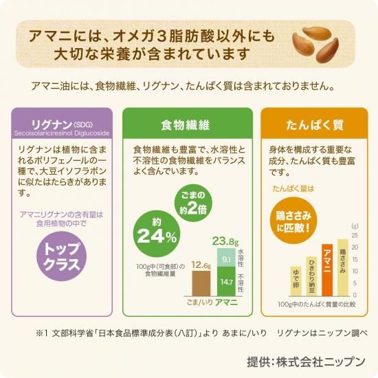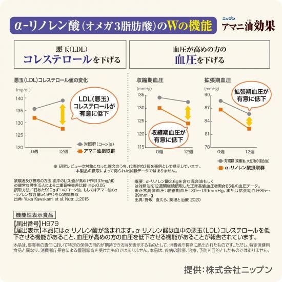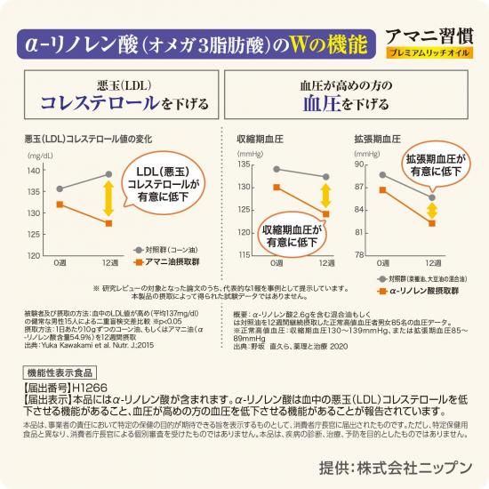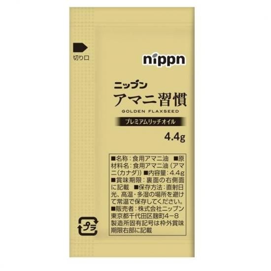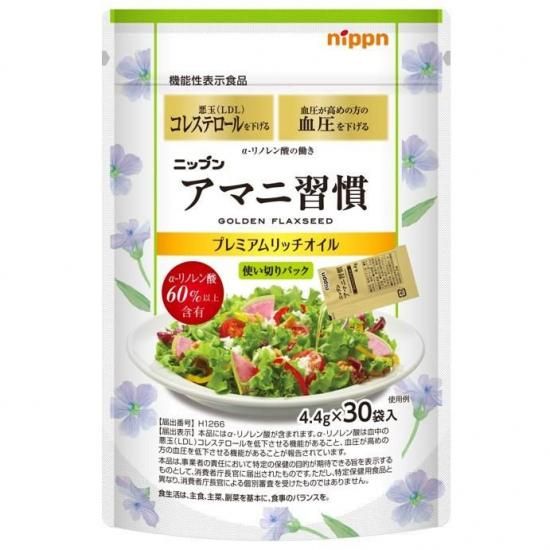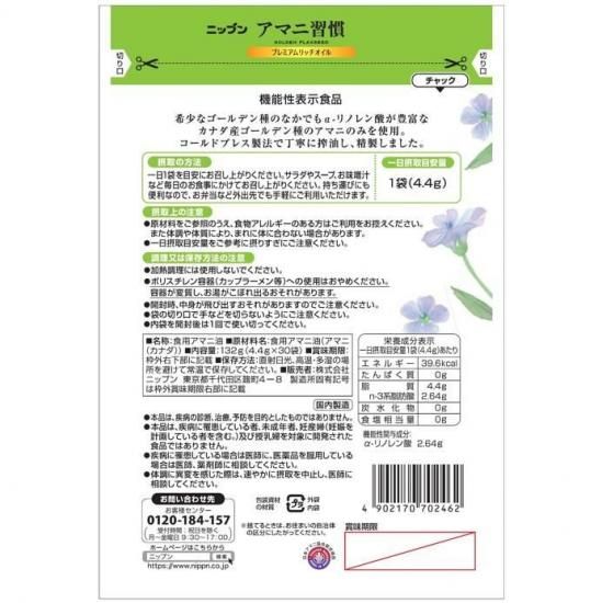 | 商品特徴 | ・希少なゴールデン種のなかでもα−リノレン酸が高含有な品種を使用したアマニオイルを使いやすい4.4g個包装のミニパックにしました。機能性表示食品。 ・届出表示「本品にはα-リノレン酸が含まれます。α-リノレン酸は血中の悪玉(LDL)コレステロール値を低下させる機能があること、血圧が高めの方の血圧を低下させる機能があることが報告されています。」 ・機能性関与成分:α-リノレン酸2.64g ・1日摂取目安量:1袋(4.4g) ・使い切りなので、計量の必要が無く、必要な分だけいつでもフレッシュ。 ・お弁当や外出時など、携帯にも便利です。 ・1袋(4.4g)にα−リノレン酸が2.64g含まれます。 【注意事項】 ・加熱調理には使用しないでください。 ・内袋はアルミを使用していますので、電子レンジで加熱すると発火する危険があります。 ・ポリスチレン容器(カップラーメン等)への使用はおやめください。容器が変質し、お湯がこぼれ出るおそれがあります。 |