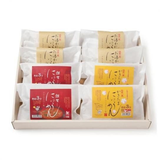 | 規格 | 8食(お湯かけにゅう麺(麺20g・スープ・かやく付)×4食、かきたまにゅうめん(麺18g・スープ・かやく付)×2食、担々にゅうめん(麺18g・スープ・かやく付)×2食) |